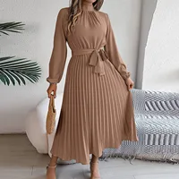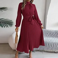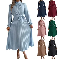 Women’s Fashion Retro Solid Color Long Sleeve Waist Pleated Skirt Stand Collar Pullover Dress