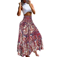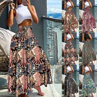 Women Casual Loose Boho Elastic Waist A-Line Beach Flowy Swing Vacation Floral Printing Maxi Skirt
